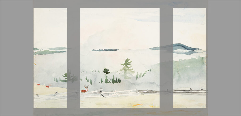 Here is a Jitterbug mural of Winslow Homer’s Landscape of a deer in a morning haze. There are several ways we can customize the triptych especially for you. Here are just are two examples: